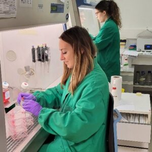 Alexia, ingénieure (au premier plan), et Valentine, étudiante en Master 1 (au second plan), cultivant des cellules tumorales sous une hotte stérile.
