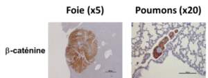 Analyse d’une tumeur dans le foie (à droite, grossissement x5) et d’une métastase pulmonaire (à gauche, grossissement x20) chez la souris par immunohistochimie (coloration marron : marquage de la protéine b-caténine).
