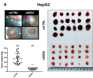 L’absence de la protéine EZH2 (« siEZH2 ») entraîne une réduction de la taille (image de gauche) et de la vascularisation (image de droite) des tumeurs hépatiques par rapport à la condition contrôle (« siCTRL »). Ces résultats montrent que la protéine EZH2 joue un rôle important dans la formation de la tumeur du foie et son caractère agressif.