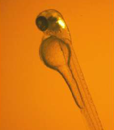Formation d’une tumeur chez l’embryon de poisson zébre après implantation de 500 cellules humaines de gliome infiltrant du tronc cérébral. Points noirs : yeux de la larve. Spot jaune doré : tumeur.